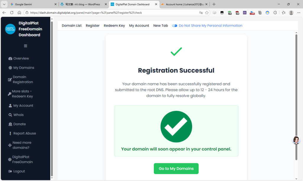 等待大约 10-30 分钟,全球 DNS 生效后,你的 us.kg 免费域名 就正式上线了!